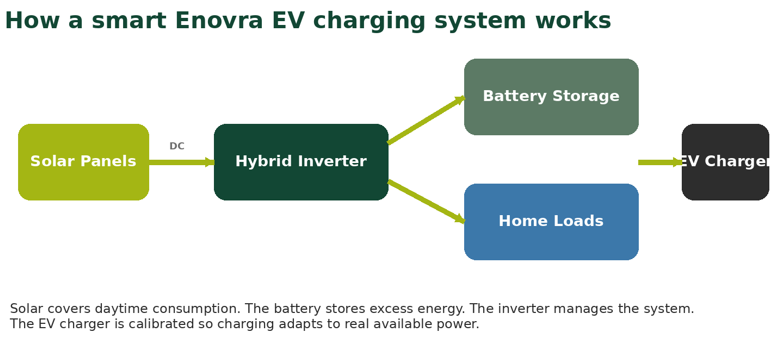 At Enovra, this is one of our clearest differentiators. We understand that smart EV charging means adjusting charging power based on solar generation, battery level, overall demand and the real capability of the system. That protects the inverter, improves the customer experience and makes the system far more credible.