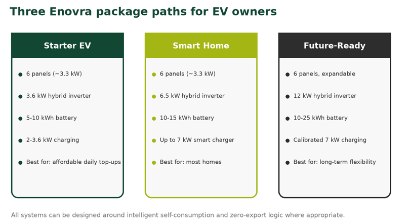 The Starter Package is designed for customers who want the cheapest sensible entry point into solar-assisted EV charging.