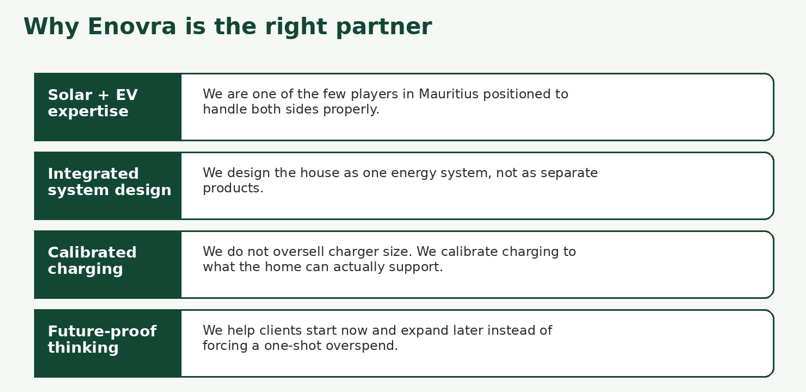 Enovra is in a uniquely strong position in Mauritius because we sit at the intersection of two markets that are now converging fast: solar and EV charging. Many providers can talk about one side of the equation. Far fewer can design the full system properly.